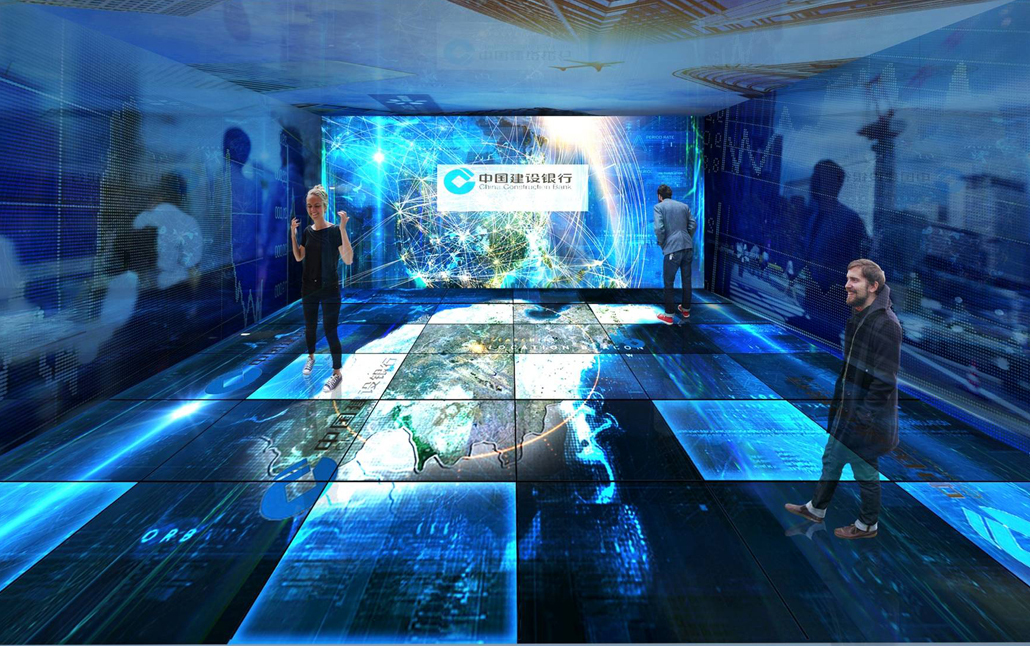 客戶體驗可以增加對產品的好感度,而且印象深刻持久。因此行史館想要達到宣傳的目的,就要讓用戶參與到展館的活動中來,這樣可以讓客戶更好的理解銀行產品。為了防止參與觀眾過多造成場地擁擠,兩個互動區域距離很遠,中間通過紀念品展示區和觀眾休息區連接。